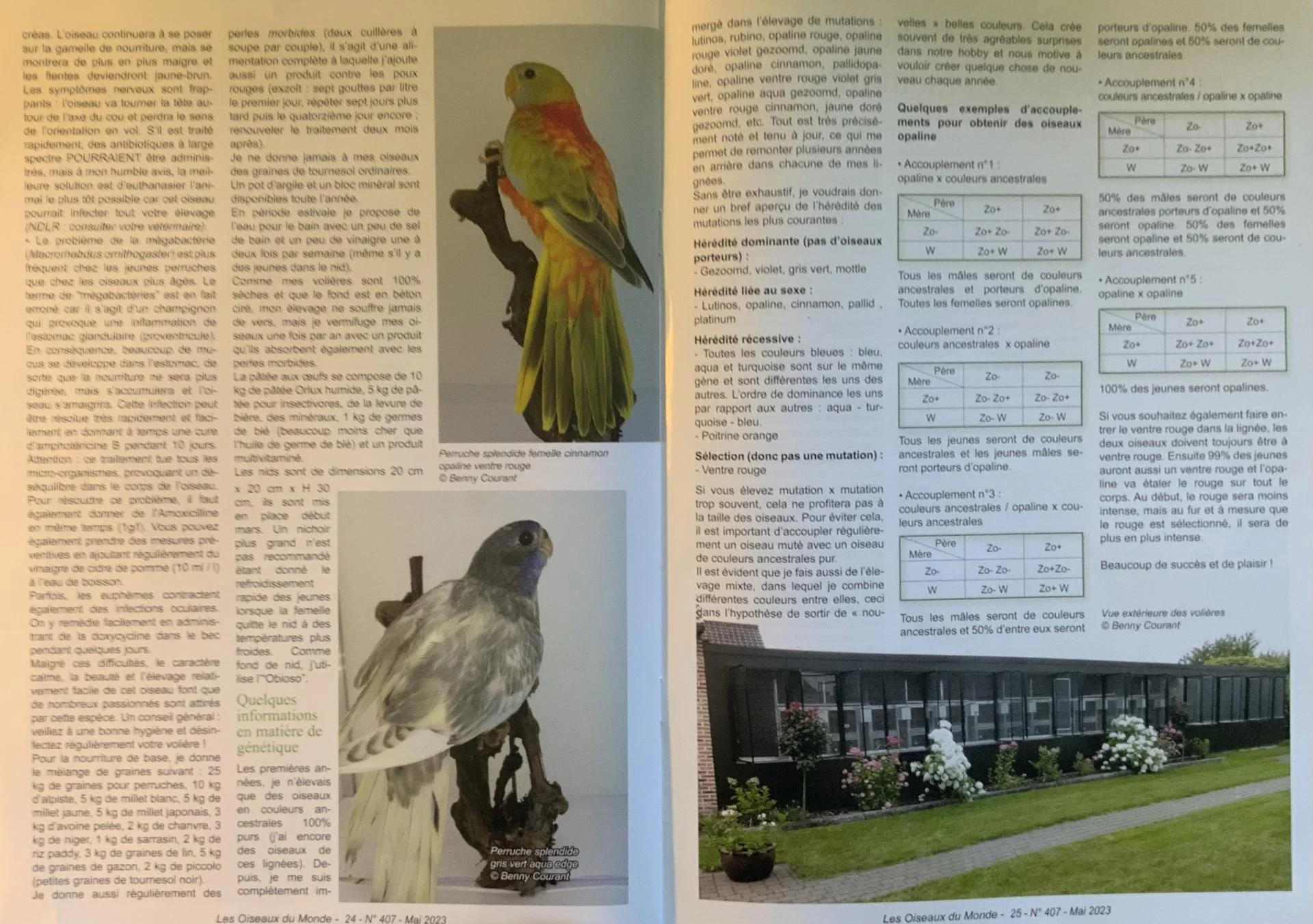 Les premières années, je n'élevais que des oiseaux en couleursancestrales 100% purs (j'ai encore des oiseaux de ces lignées). Depuis, je me suis complètement immergé dans l'élevage de mutations : lutinos, rubino, opaline rouge, opaline rouge violet gezoomd, opaline jaunedoré, opaline cinnamon, pallidopaline, opaline ventre rouge violet gris vert, opaline aqua gezoomd, opaline ventre rouge cinnamon, jaune dorégezoomd, etc. Tout est très précisément noté et tenu à jour, ce qui me permet de remonter plusieurs années en arrière dans chacune de mes lignées.